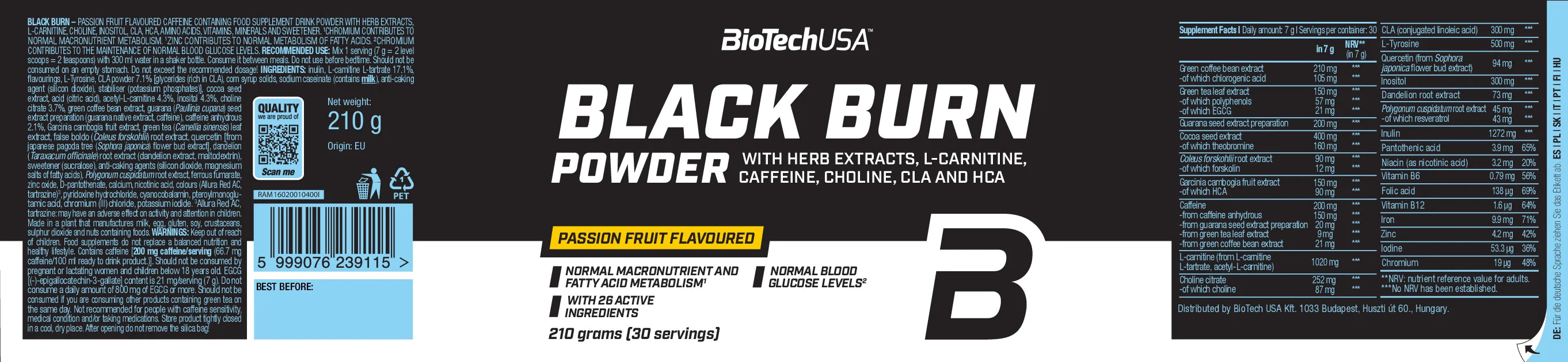 Black Burn de BioTechUSA es un suplemento termogénico avanzado diseñado para personas activas y deportistas que buscan maximizar la pérdida de grasa, aumentar la energía y apoyar sus objetivos de definición corporal. Este producto combina una fórmula potente con múltiples ingredientes clave que actúan en sinergia para favorecer el metabolismo energético y de las grasas.